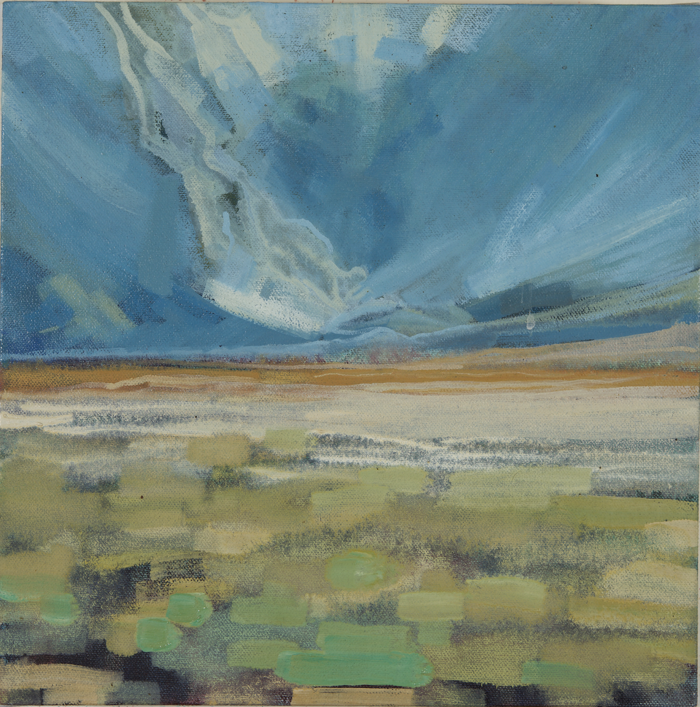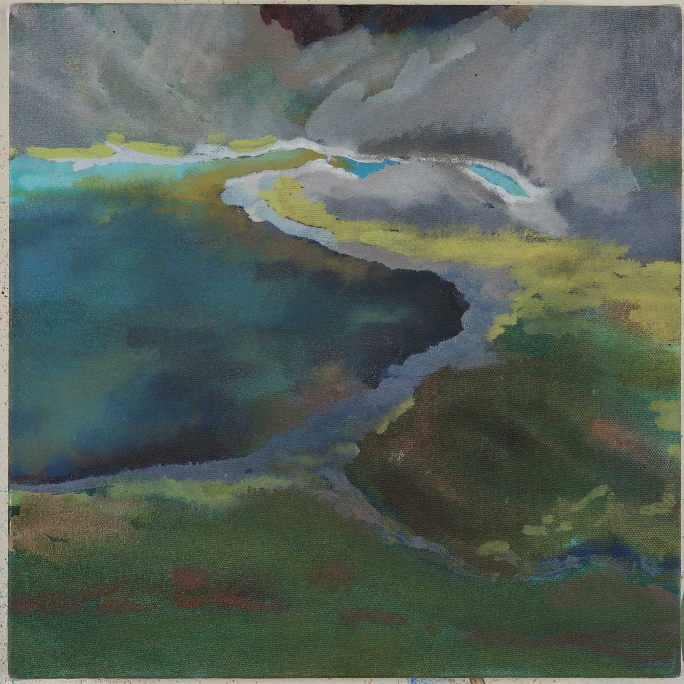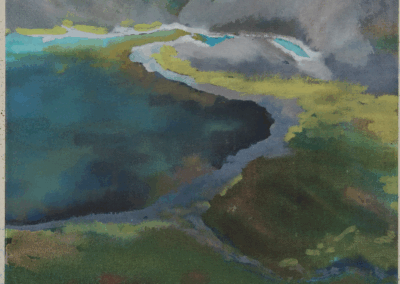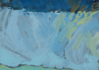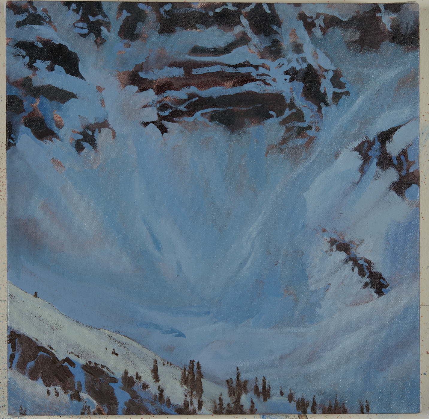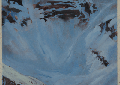 “Every painting at Montanya is of Velocity Basin – different view points, times of day and seasons. All of the paintings say something about the qualities of paint and also the feeling and look of Velocity, though to different degrees. Some paintings are more abstract while others are more faithful to features of nature. As I was working on these Velocity paintings, I would periodically visit Montanya for social gatherings and I noticed the beautiful spaces, with empty walls. I considered the people who come to Montanya, like Silverton Mountain skiers and others who have had such deep experiences in Velocity. I loved the word “Montanya,” and that it is the Spanish word for mountain. I thought, “What a perfect fit.” It seems that everyone has a story about Velocity, beginning long before the Olympic Gold Metal winner, Shaun White’s “secret half pipe,” was built in the south end of Velocity Basin. Besides being the inspiration for these paintings, Velocity is the place where my friend Claudia Pope and I had our dangerous encounter with the Akbash, the ancient breed of Turkish sheep guard dogs. The events of this encounter unfolded as I was putting in a camp above the lake, for the purpose of beginning this series. (I live in and wake up in the places I paint. To that end I backpack and also pack my dogs in the wilderness of Southwestern Colorado.)”
